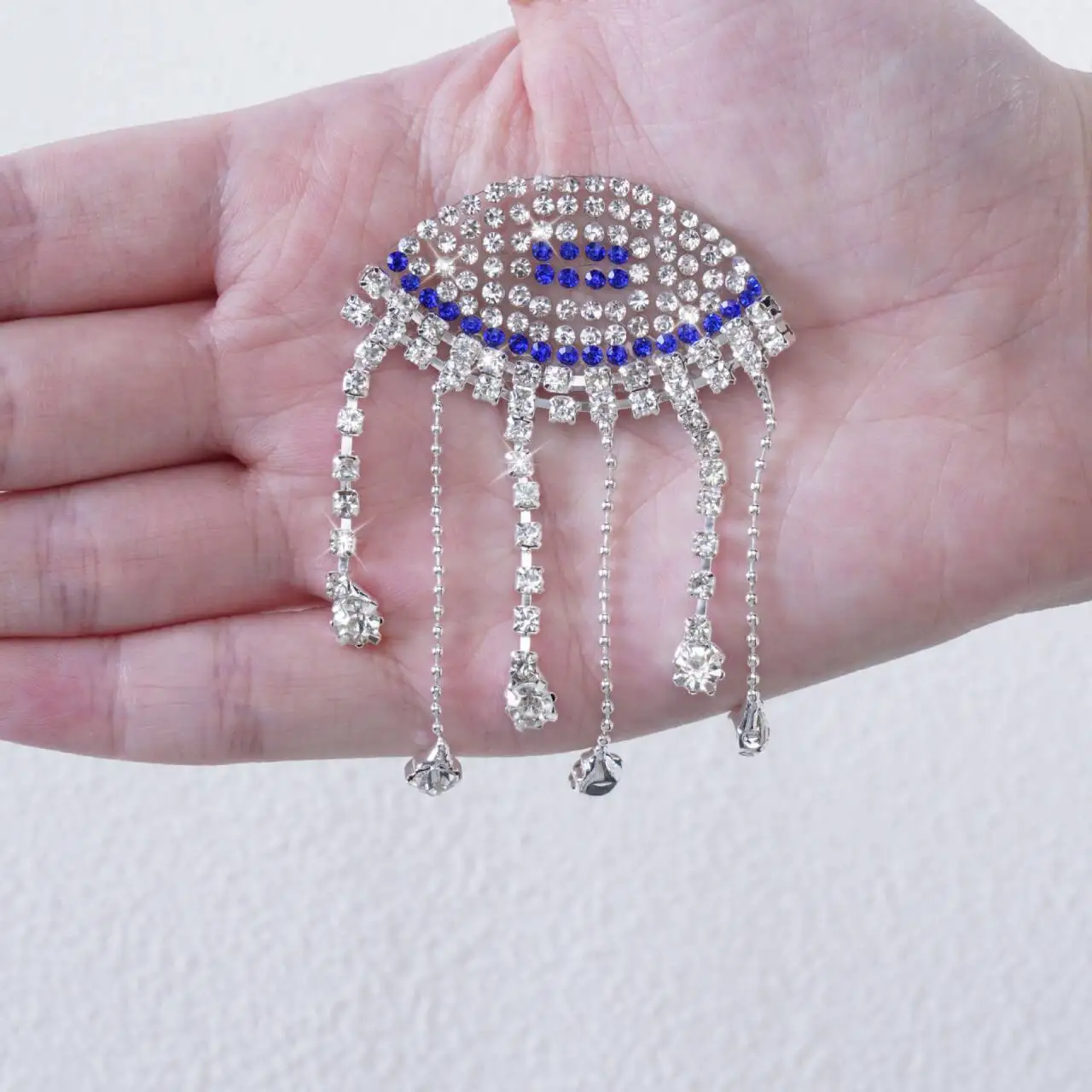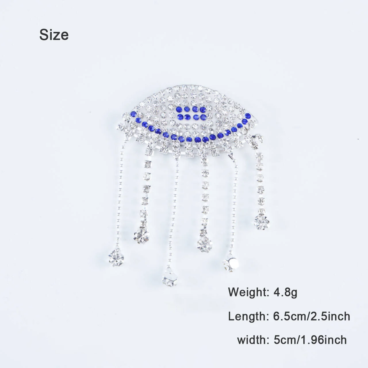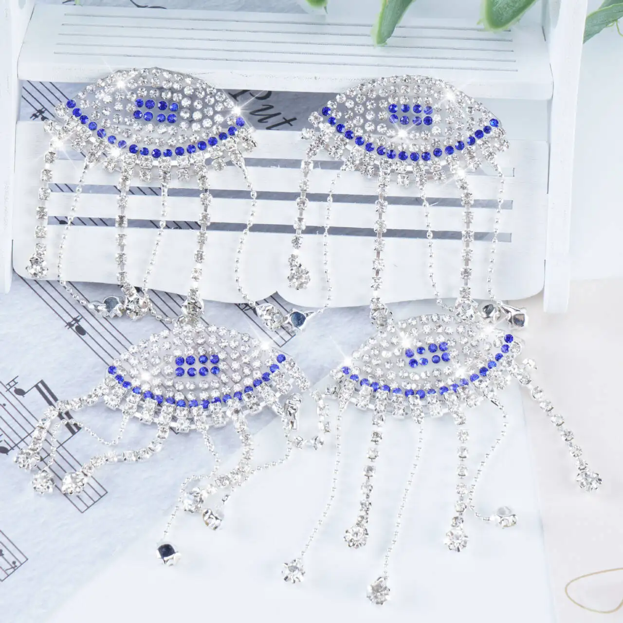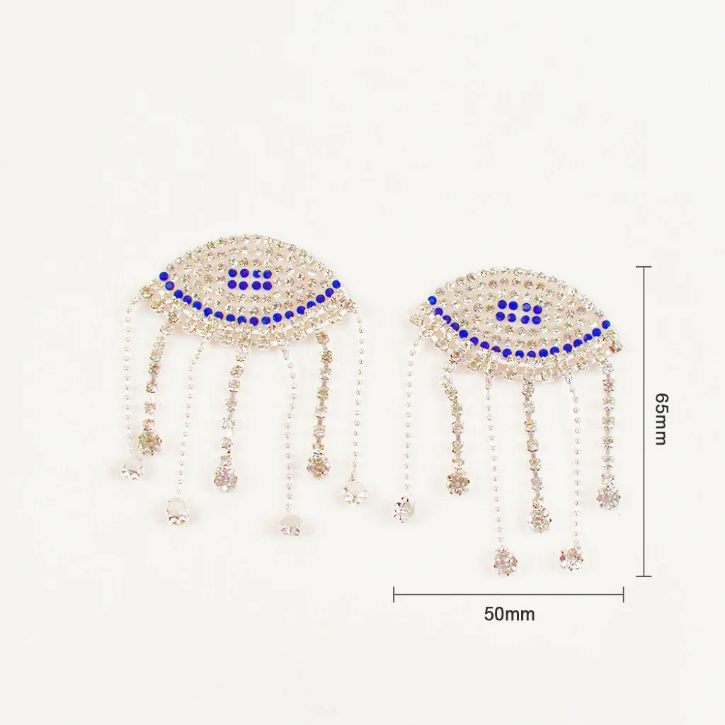 Hershe Devil's Eye Rhinestone Nipple Covers Silver Blue Reusable Breast Stickers with Beaded Tassels 6.5x5cm Fashion Sexy Luxury